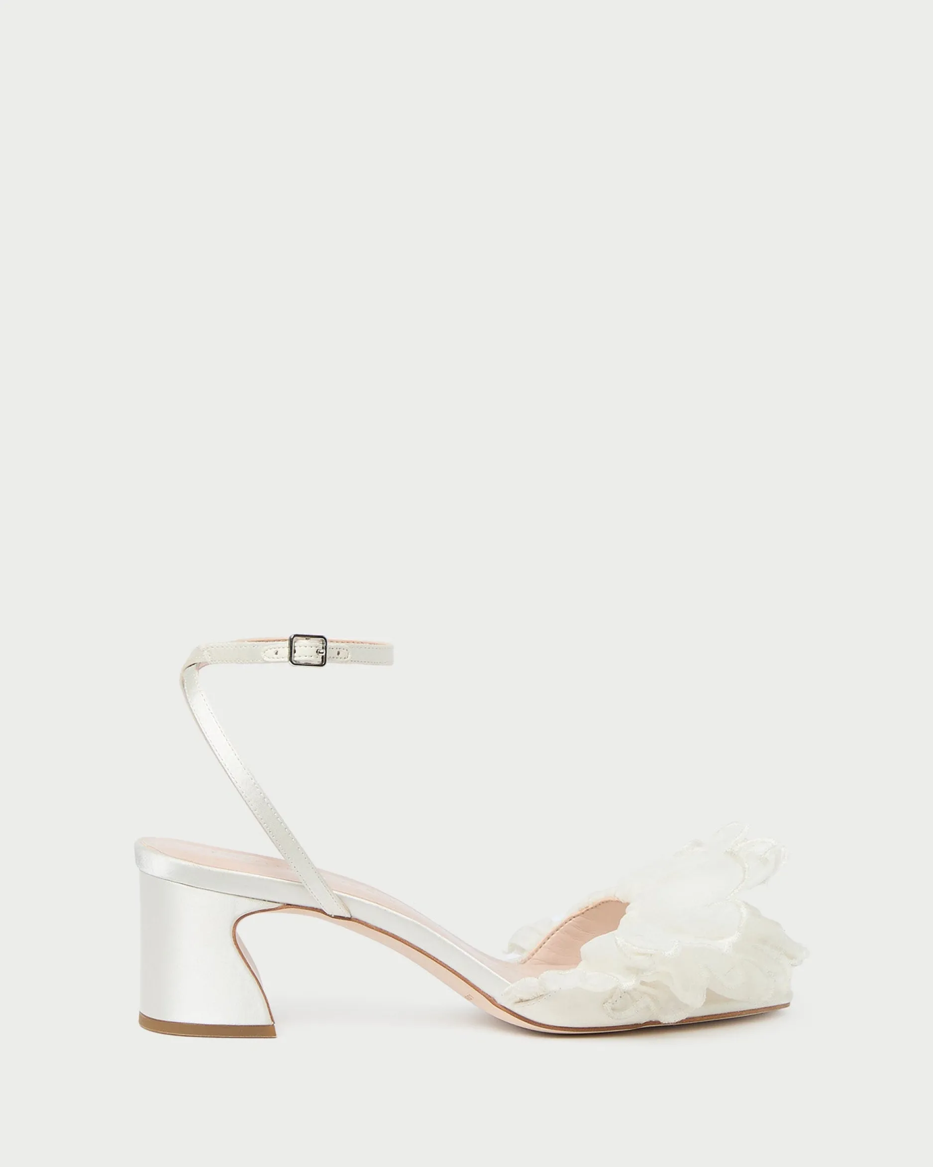 Welcome to Loeffler Randall. Discover our collection of beautiful, handcrafted styles from shoes to RTW to accessories. |Mid-height curved-heel sandal in cream Italian satin. Features a single-band upper with pearl organza ruffles, an adjustable ankle strap, a padded leather footbed, and an open toe. 2-inch heel.|Treat with a water repellent to ward off dirt and stains prior to wear. Avoid contact with water, and clean with professional care only.|Mid-height curved-heel sandal in cream Italian satin. Features a single-band upper with pearl organza ruffles, an adjustable ankle strap, a padded leather footbed, and an open toe. 2-inch heel.