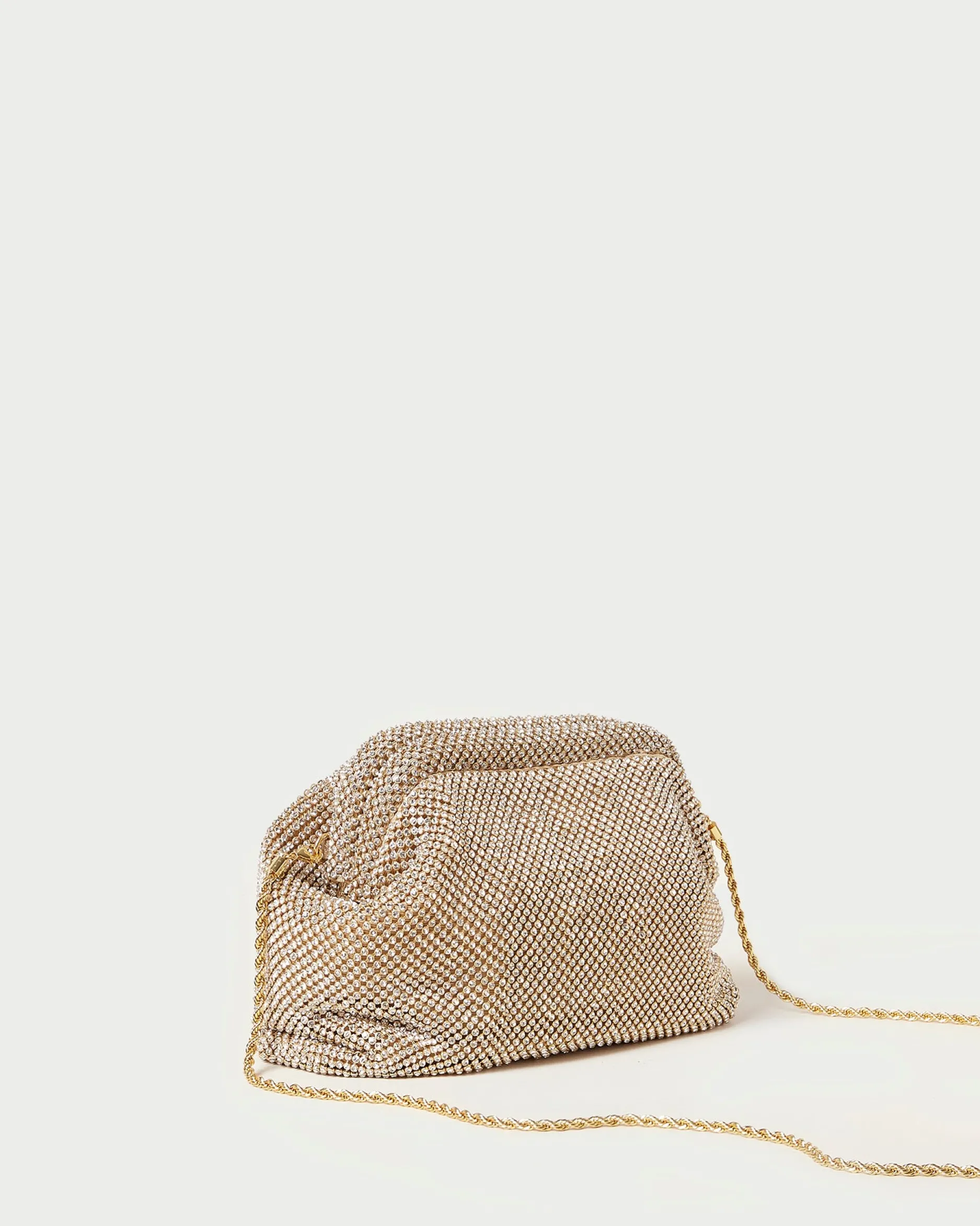 Welcome to Loeffler Randall. Discover our collection of beautiful, handcrafted styles from shoes to RTW to accessories. |Frame pouch in gold diamanté mesh. Features a removable twisted gold metal chain strap, frame closure, full lining, and an interior slip pocket.|Recommended to avoid abrasive materials and rough surfaces. Store in a dust bag out of direct sunlight.|Frame pouch in gold diamanté. mesh. Features a removable twisted gold metal chain strap, frame closure, full lining, and an interior slip pocket.