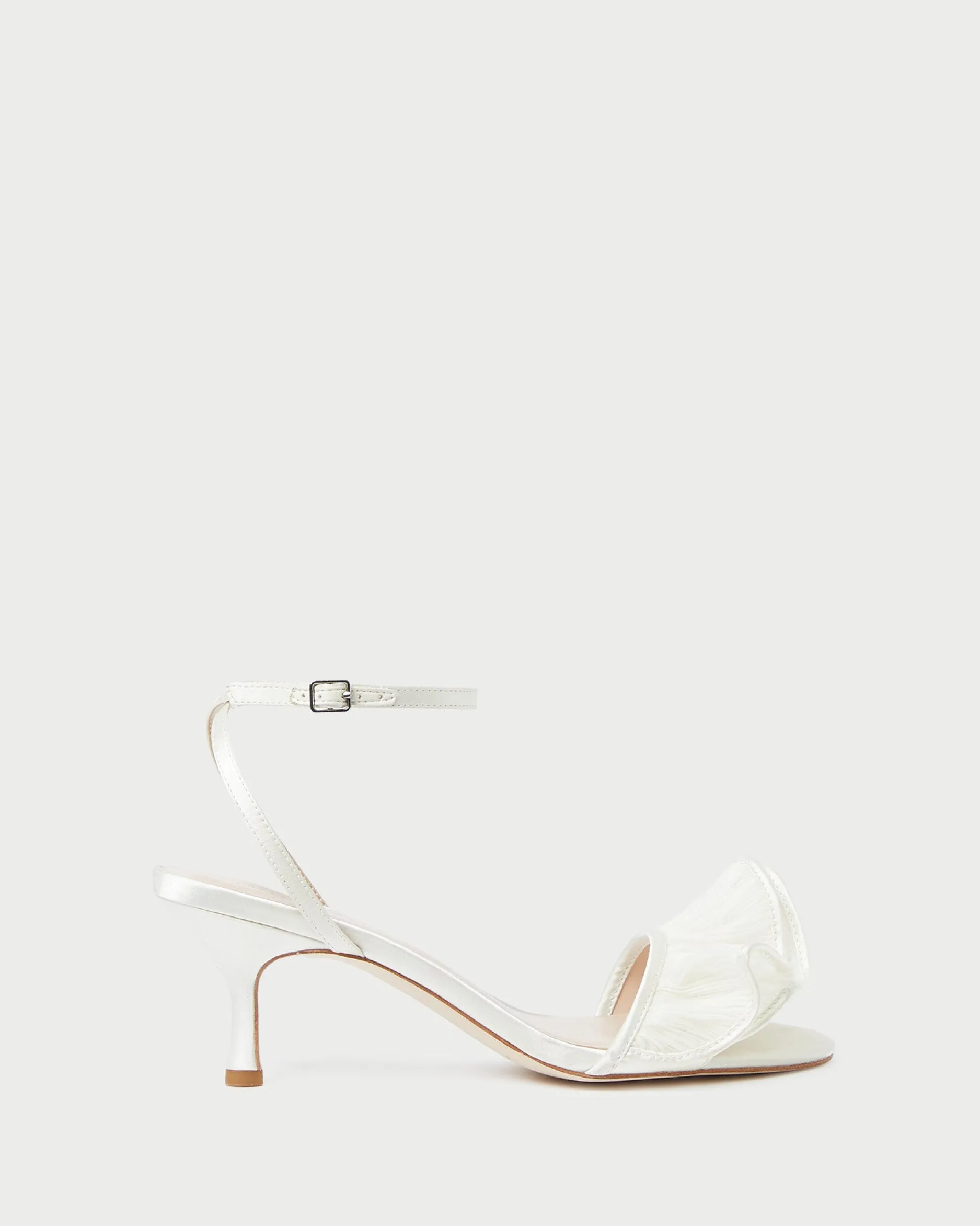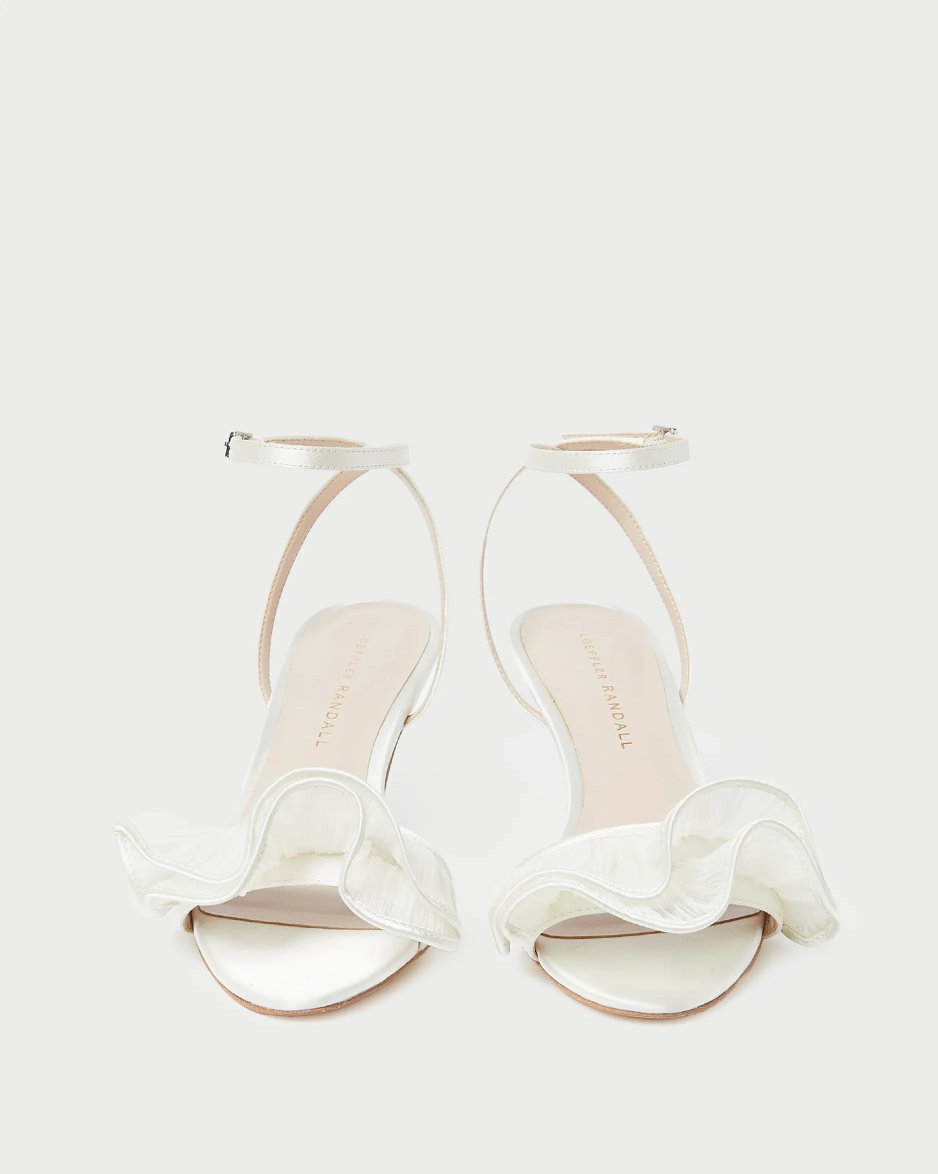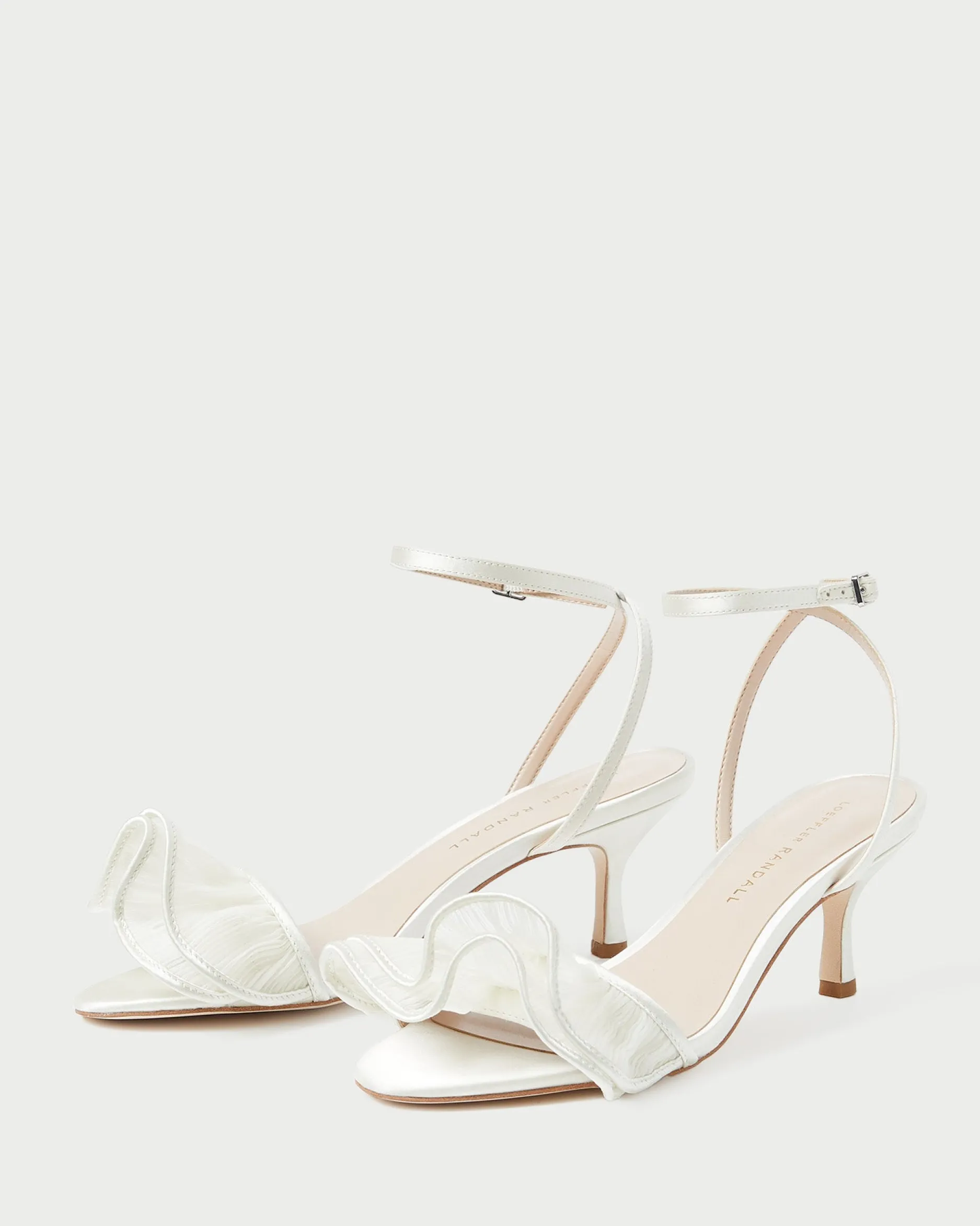 Welcome to Loeffler Randall. Discover our collection of beautiful, handcrafted styles from shoes to RTW to accessories. |Mid-heel sandal with a ruffled upper in pearl organza with a cream satin ruffle. Features a padded leather footbed, an open toe, and an adjustable ankle strap. 2.5-inch heel.|Treat with a water repellent to ward off dirt and stains prior to wear. Avoid contact with water, and clean with professional care only.|Mid-heel sandal with a ruffled upper in pearl organza with a cream satin ruffle. Features a padded leather footbed, an open toe, and an adjustable ankle strap. 2.5-inch heel.