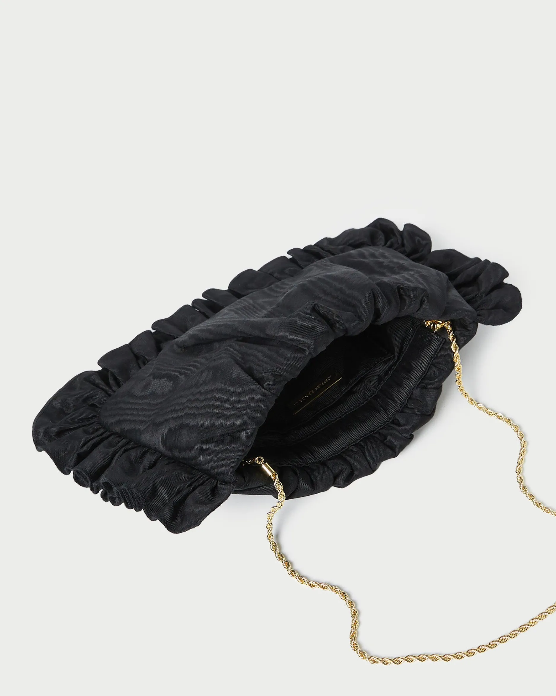 Welcome to Loeffler Randall. Discover our collection of beautiful, handcrafted styles from shoes to RTW to accessories. |Clutch in natural crocheted raffia with ruffle detailing. Features a removable twisted gold chain strap, frame closure, and interior card slot.|We selected this material for its exceptional quality and appearance. As with most natural materials, variations in thickness and color are to be expected. Due to the delicate nature of the fiber, normal wear may occur over time. It is recommended that raffia not be exposed to water in order to maintain its appearance.|Clutch in black and brown checked taffeta with ruffle detailing. Features a removable twisted gold chain strap, frame closure, and interior card slot.||Clutch in vanilla moiré with ruffle detailing. Features a removable twisted gold chain strap, frame closure, and interior card slot.|Italian moiré fabric is delicate and subject to pulls in thread with contact to abrasive materials. Wear with care.|Clutch in black moiré with ruffle detailing. Features a removable twisted gold chain strap, frame closure, and interior card slot.|Italian moiré fabric is delicate and subject to pulls in thread with contact to abrasive materials. Wear with care.|Clutch in natural crocheted raffia with ruffle detailing. Features a removable twisted gold chain strap, frame closure, and interior card slot.