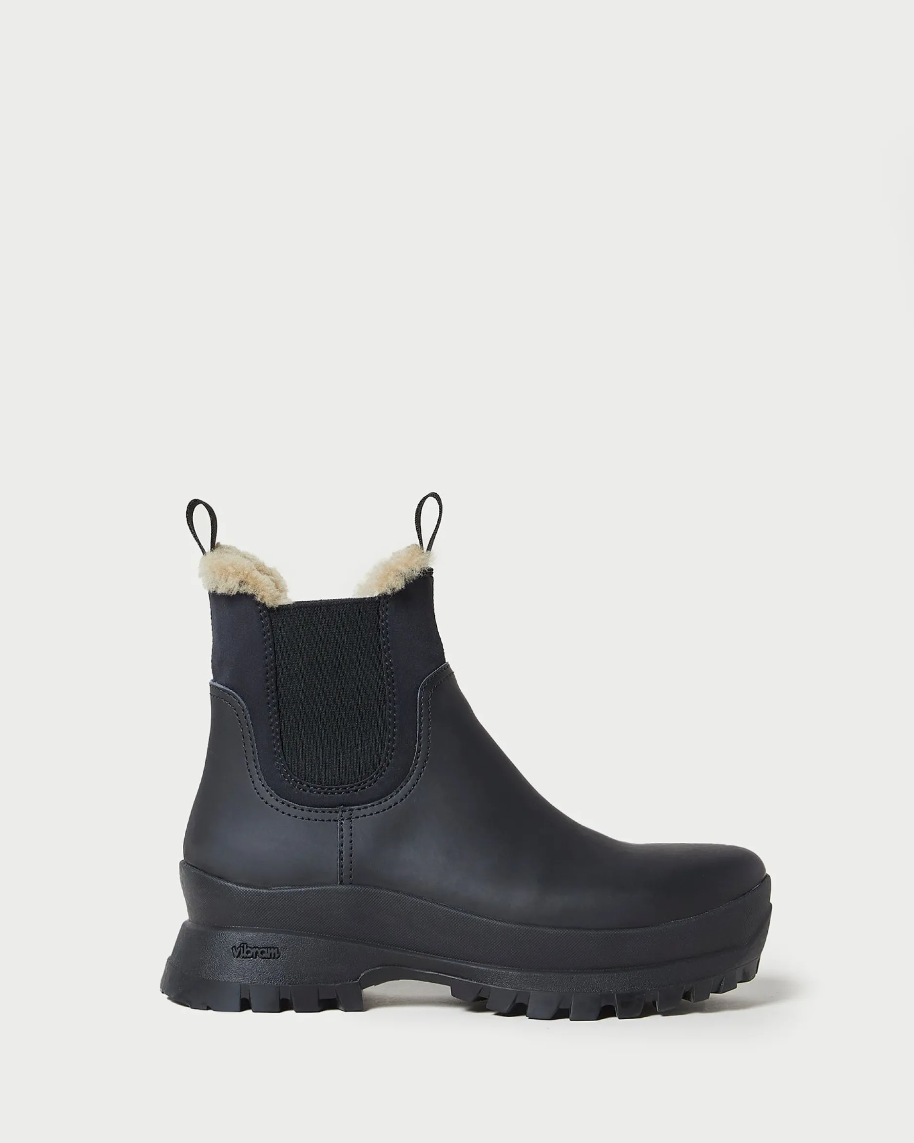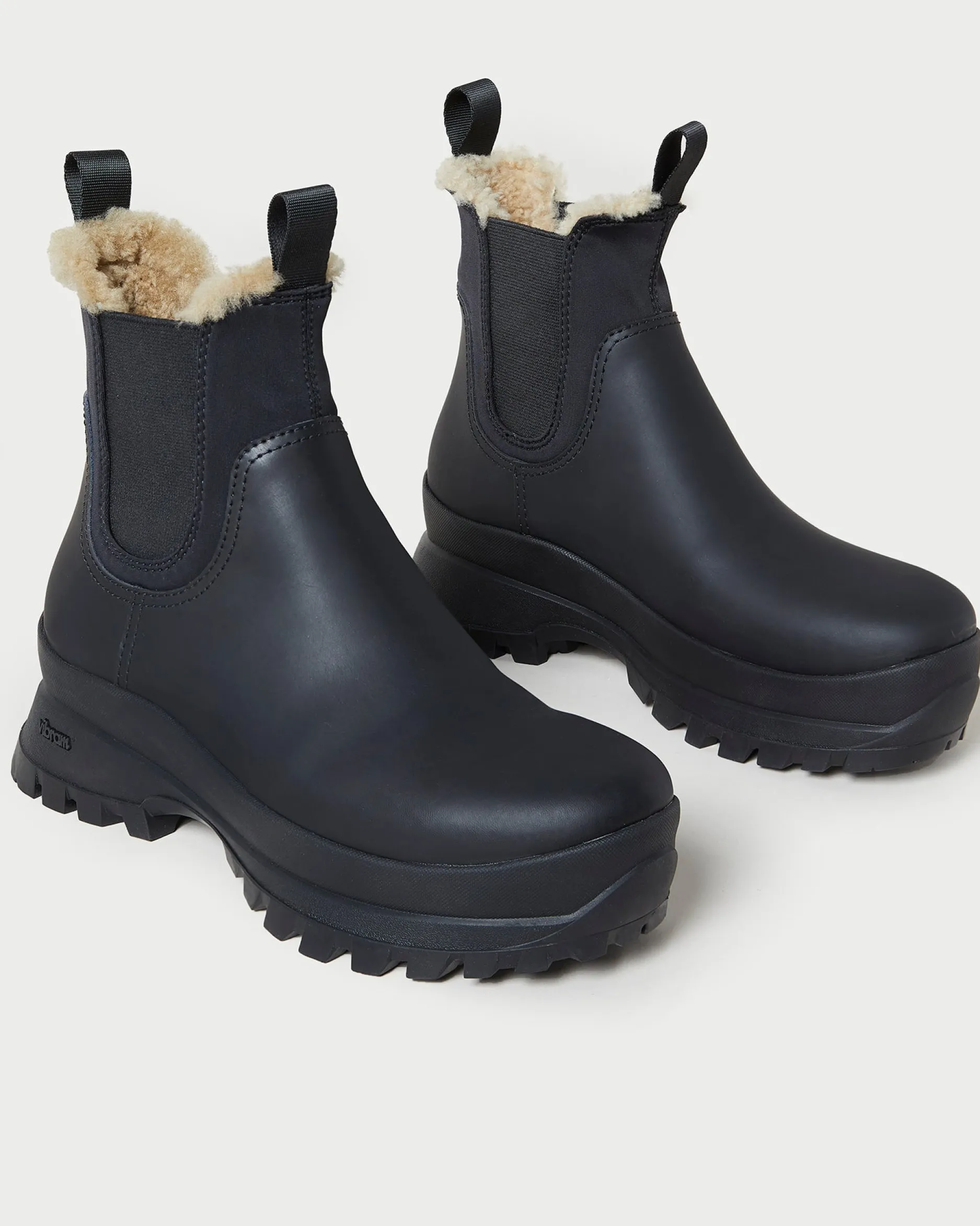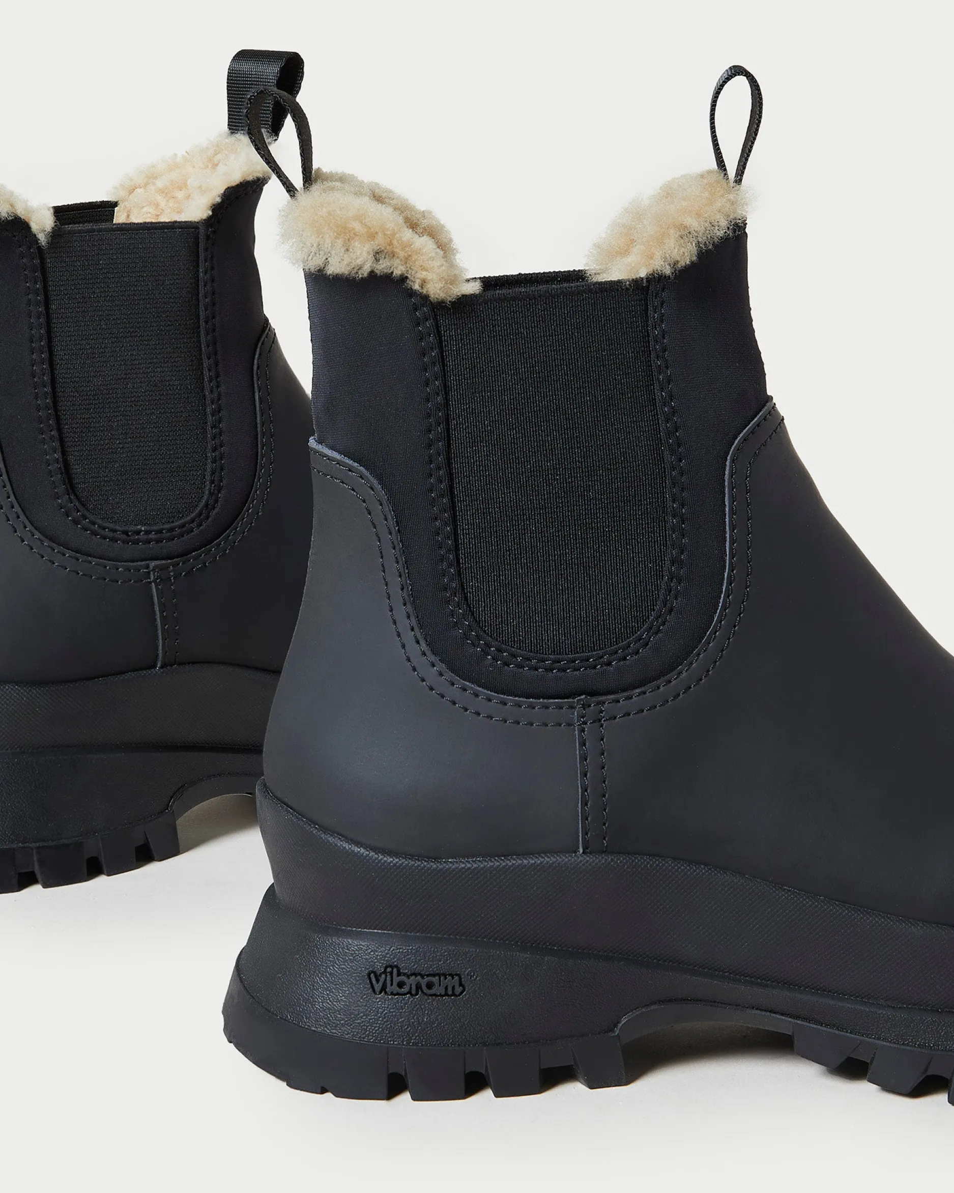 Welcome to Loeffler Randall. Discover our collection of beautiful, handcrafted styles from shoes to RTW to accessories. |u003cpu003ePull-on bootie in water-resistant black leather with cream-colored shearling, stretch neoprene panels, and pull tabs. This bootie has a Vibram® outsole, which is engineered for quality and comfort with traction optimized for unstable terrain. 1.75 inch heel.u003c/pu003e|Leather boot can be exposed to light rain and shallow snow elements. For best results after wear in snowy streets, wipe clean to remove any salt which could deteriorate the leather. For the shearling, a suede brush can be used to remove surface-level dust or soil, and a non-silicone water-repellent spray can be used for protection. Any stains should be treated by a professional.|Pull-on bootie in water-resistant black leather with cream-colored shearling, stretch neoprene panels, and pull tabs. This bootie has a Vibram® outsole, which is engineered for quality and comfort with traction optimized for unstable terrain. 1.75 inch heel.