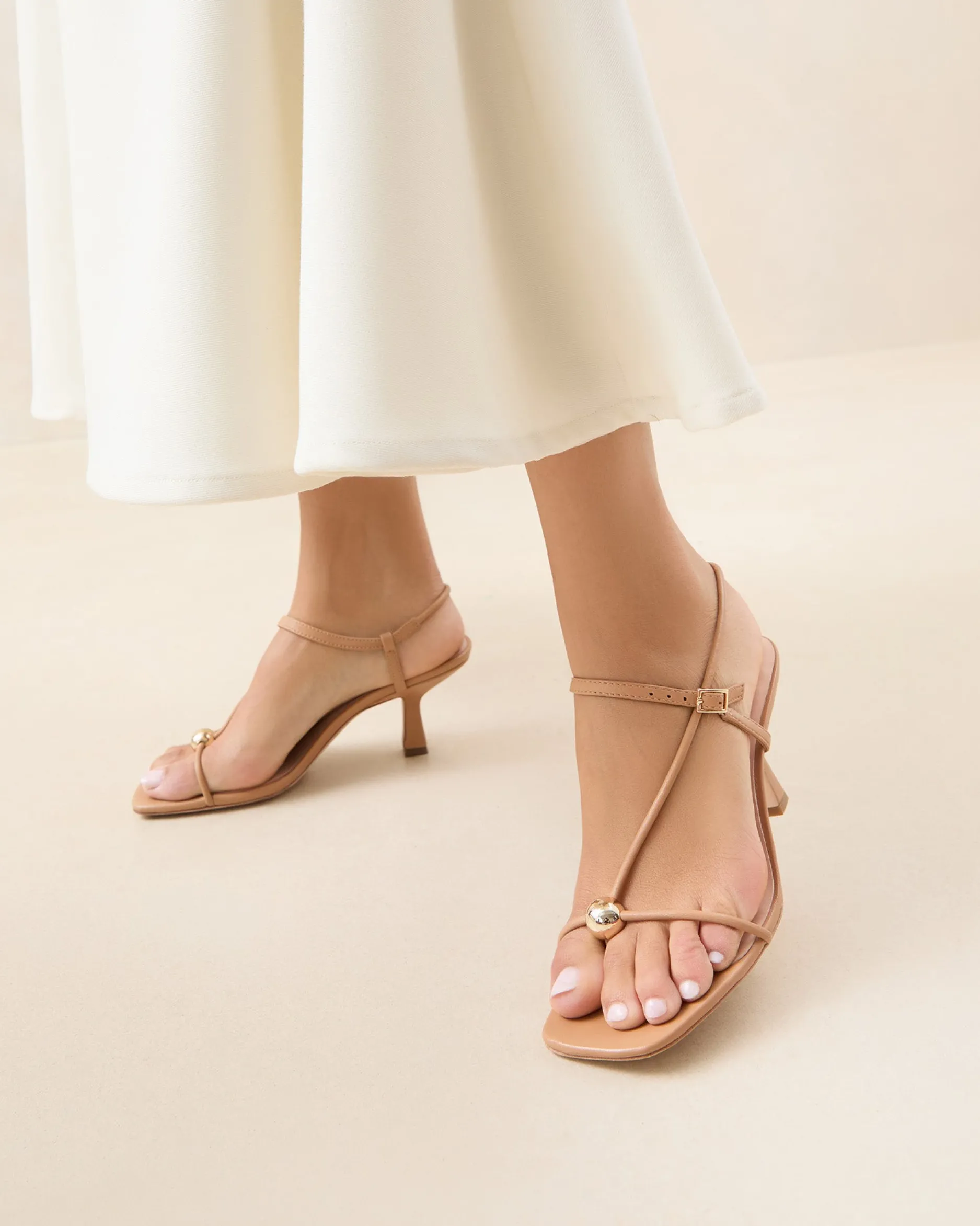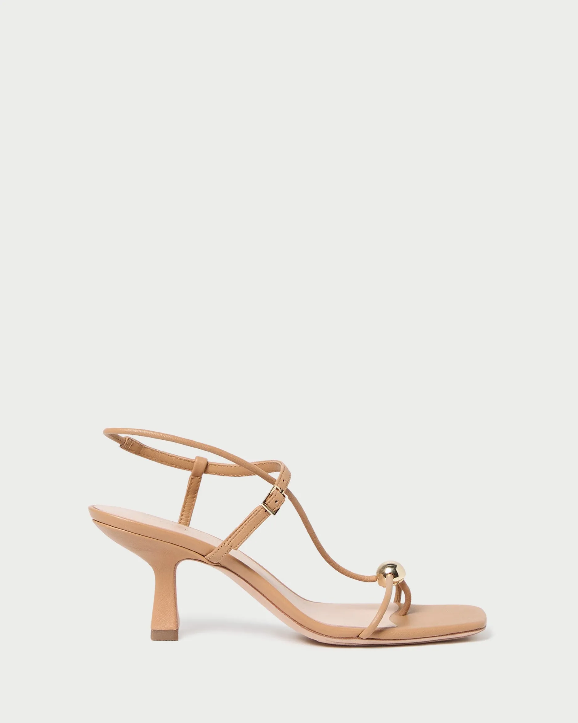 Welcome to Loeffler Randall. Discover our collection of beautiful, handcrafted styles from shoes to RTW to accessories. |Mid-heel sandal in dune nappa leather. Features a padded footbed with gold stamped logo, an open toe, and a delicate strappy design with buckle closure and gold ball detail. 2.75-inch heel.|Nappa is a soft and supple leather and may show wear and scuffing. Refurbish seasonally or as needed by a professional. For best results, avoid consistent exposure to water.|Mid-heel sandal in dune nappa leather. Features a padded footbed with gold stamped logo, an open toe, and a delicate strappy design with buckle closure and gold ball detail. 2.75-inch heel.
