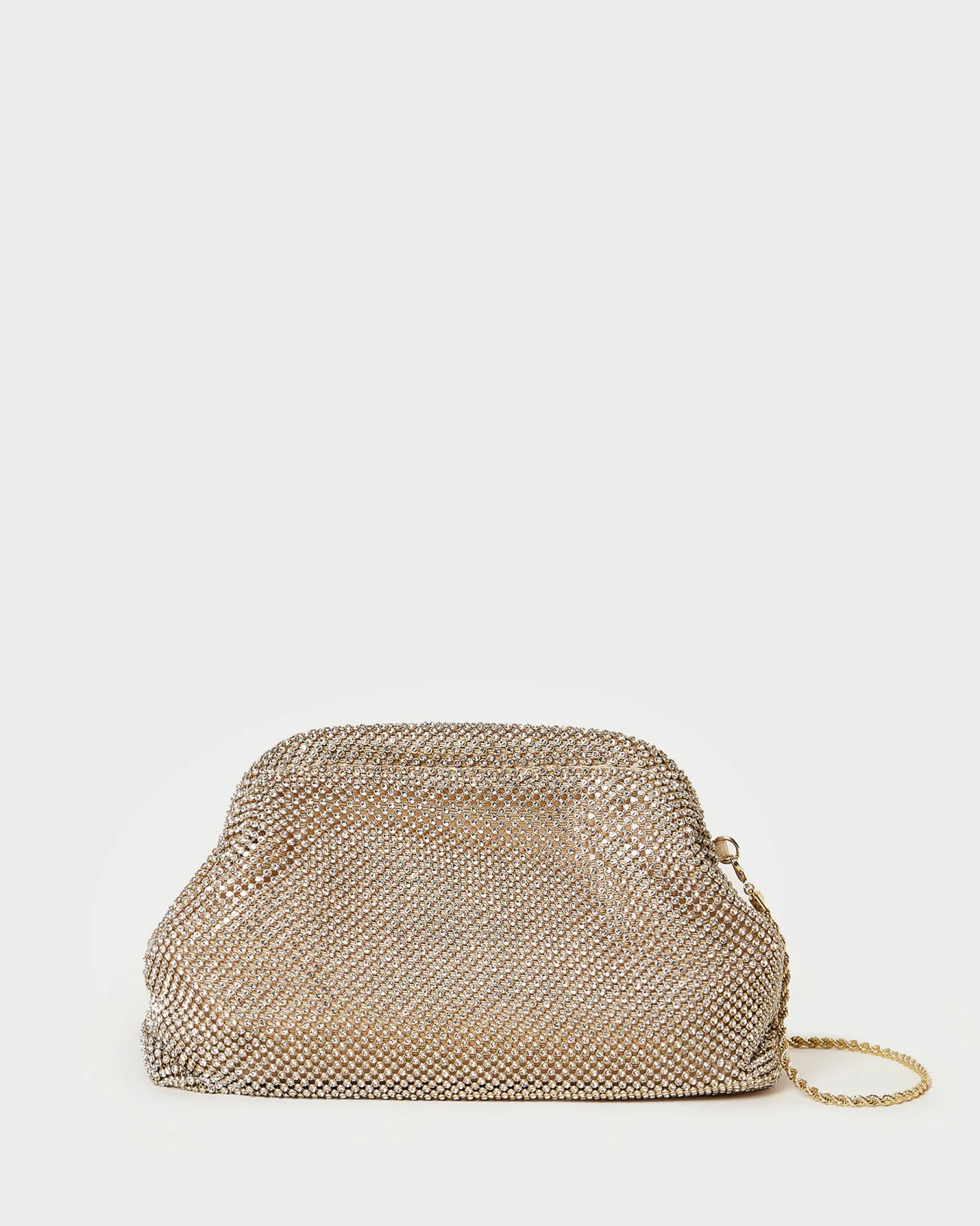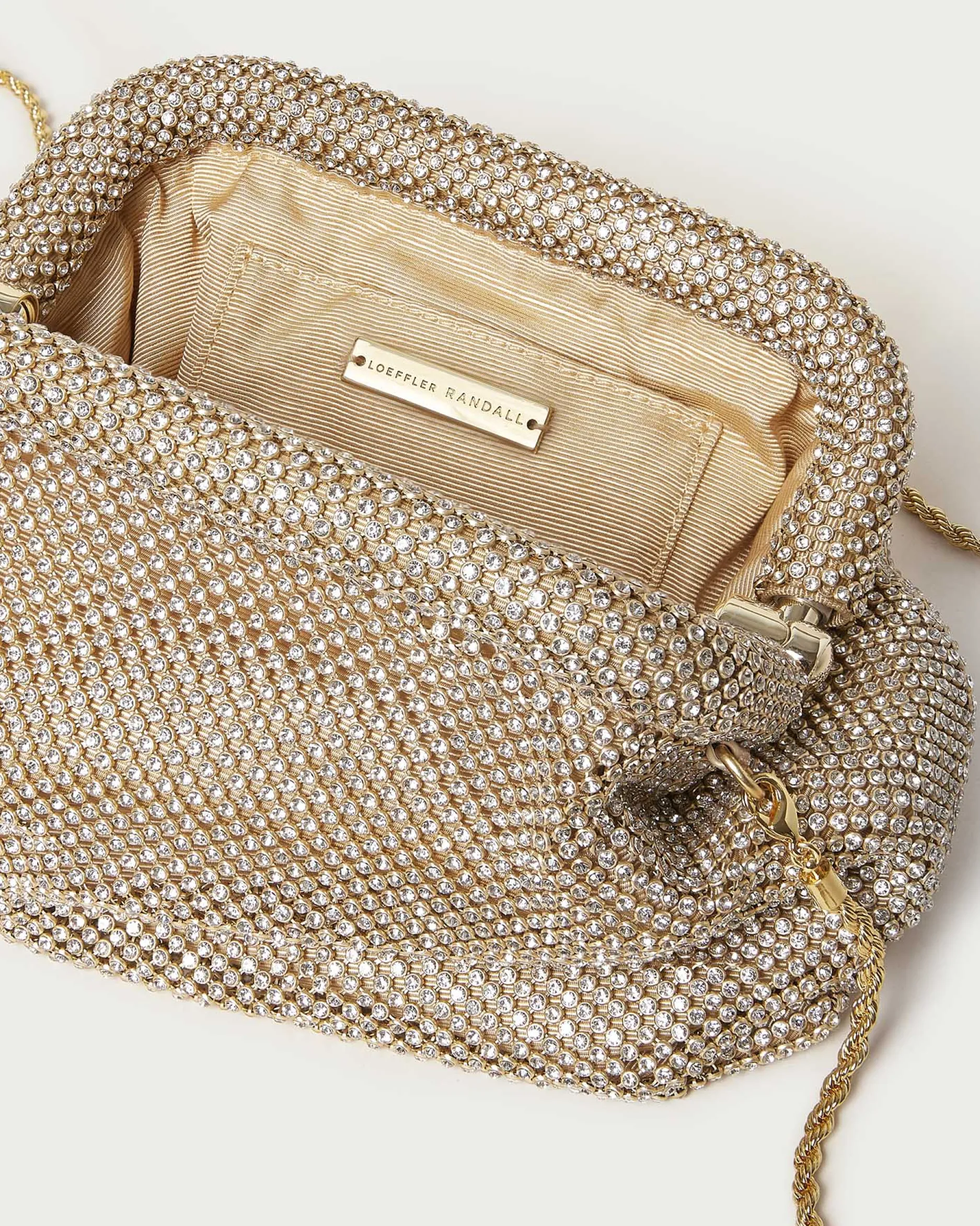 Welcome to Loeffler Randall. Discover our collection of beautiful, handcrafted styles from shoes to RTW to accessories. |Frame pouch in gold diamanté mesh. Features a removable twisted gold metal chain strap, frame closure, full lining, and an interior slip pocket.|Recommended to avoid abrasive materials and rough surfaces. Store in a dust bag out of direct sunlight.|Frame pouch in gold diamanté. mesh. Features a removable twisted gold metal chain strap, frame closure, full lining, and an interior slip pocket.