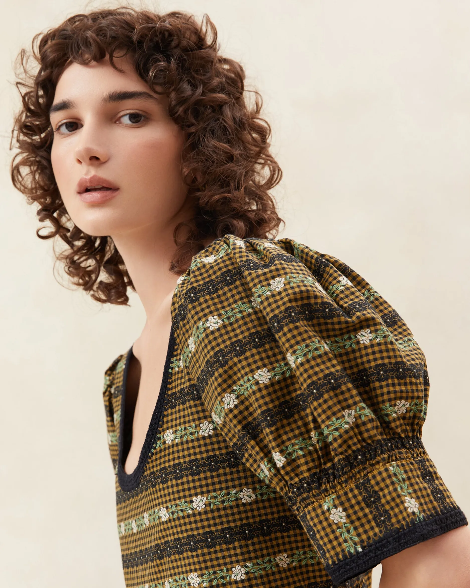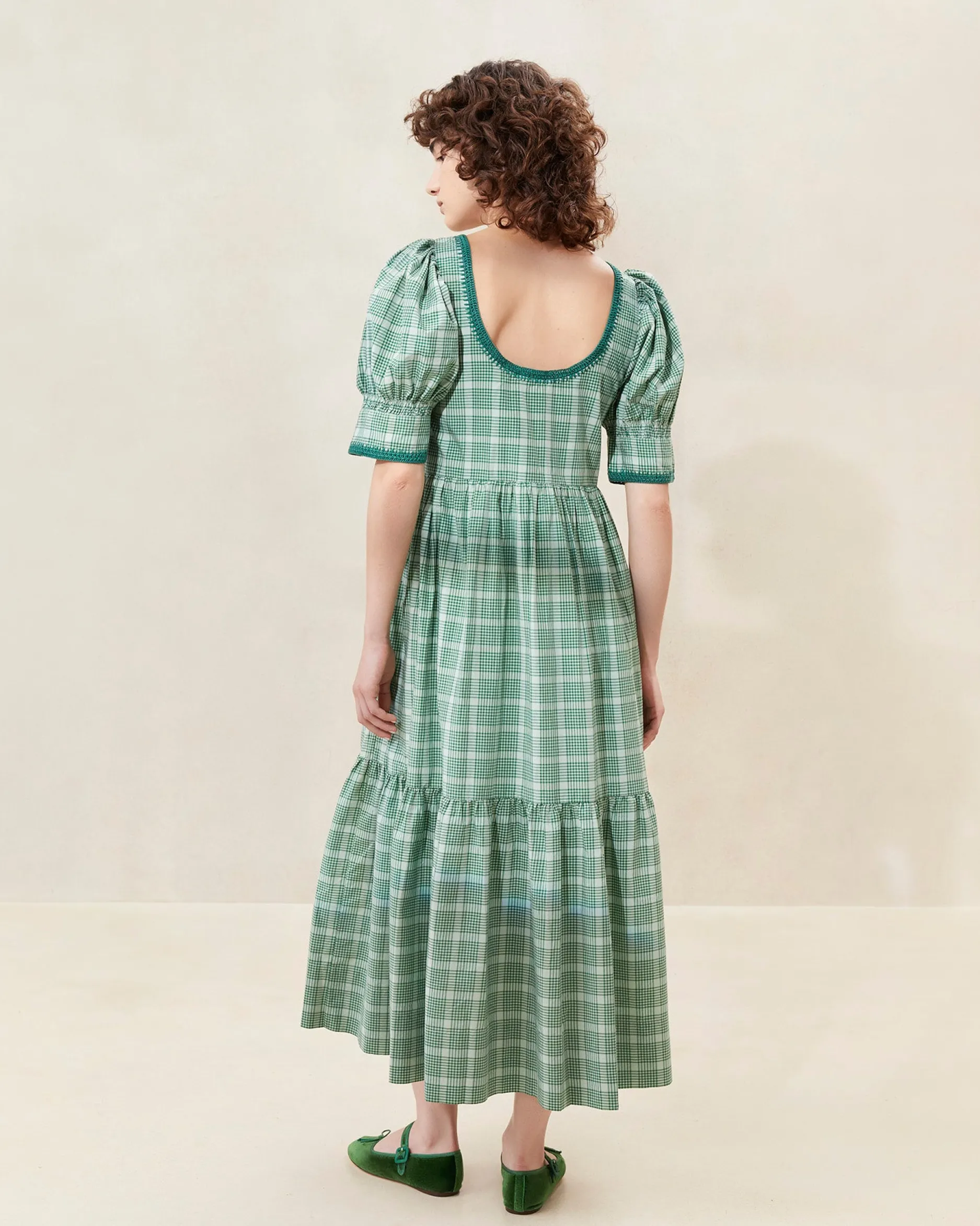 Welcome to Loeffler Randall. Discover our collection of beautiful, handcrafted styles from shoes to RTW to accessories. |Midi tiered dress in cream and blue wavy floral print poplin. Features puff sleeves, cinched bodice, pockets, and cream-colored whipstitch trim.|Hand wash cold separately. Do not bleach. Line dry. Iron cool. Do not dry clean.|Midi tiered dress in mint green plaid taffeta. Features puff sleeves, a cinched bodice, pockets, and cream-colored whipstitch trim.|Hand wash cold or dry clean.|Midi tiered dress in black and brown checked floral print poplin. Features puff sleeves, cinched bodice, pockets, and cream-colored whipstitch trim.|Hand wash cold separately. Do not bleach. Line dry. Iron cool. Do not dry clean.|Midi tiered dress in cream and blue wavy floral print poplin. Features puff sleeves, cinched bodice, pockets, and cream-colored whipstitch trim. SizeXSSMLXLBust33.5"35.5"37.5"39.5"41.5"Waist33"35"37"39"41"Length49"49.5"50"50.5"51"