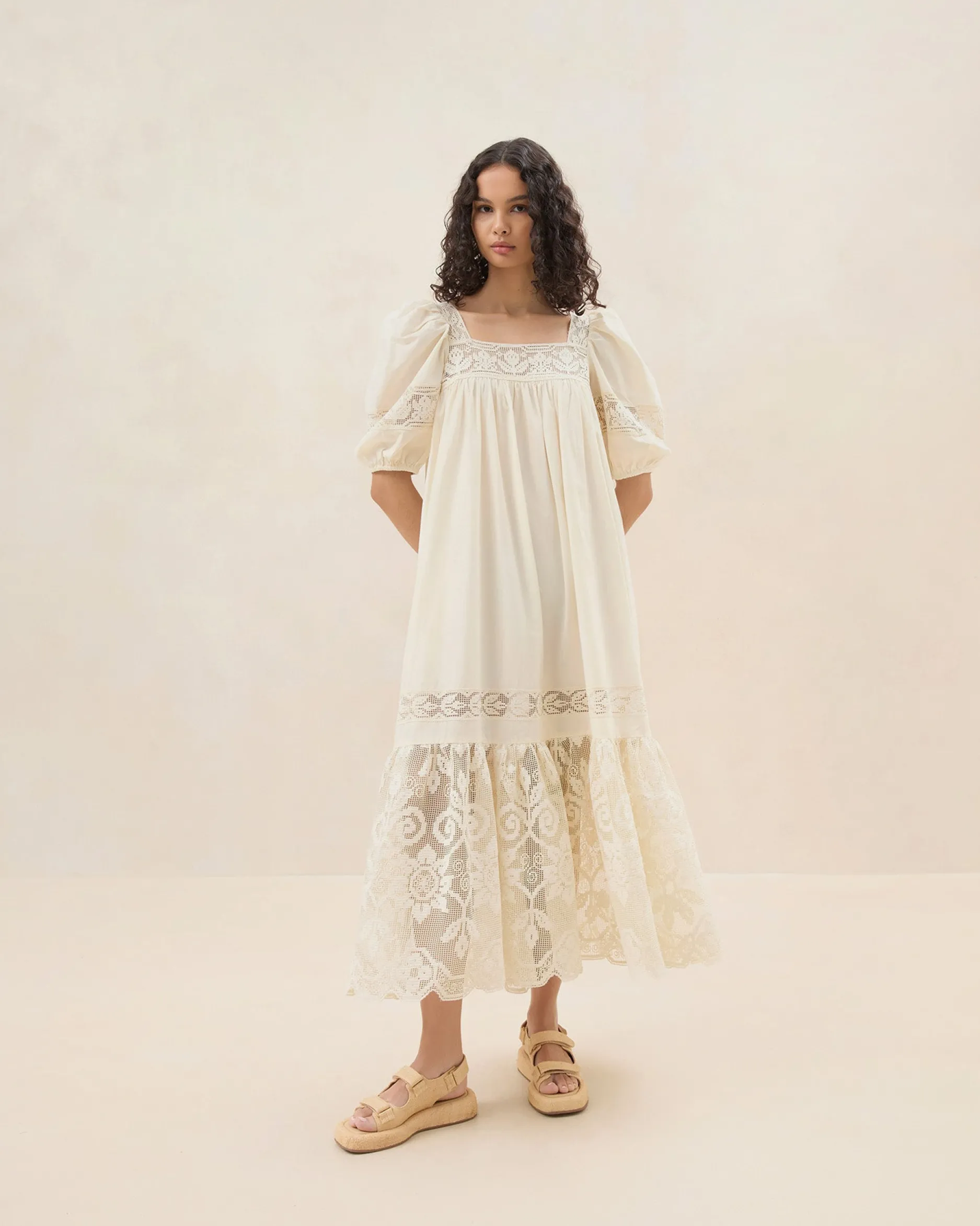 Welcome to Loeffler Randall. Discover our collection of beautiful, handcrafted styles from shoes to RTW to accessories. |Maxi dress in cream-colored cotton with tonal lace. Features puff sleeves, a squared neckline, and a flowy fit. Unlined. Pulls on.|Dry clean only.|Maxi dress in cream-colored cotton with tonal lace. Features puff sleeves, a squared neckline, and a flowy fit. Unlined. Pulls on. SizeXSSMLXLBust33"35"37"39"41"Length49.5"50"50.5"51"51.5"