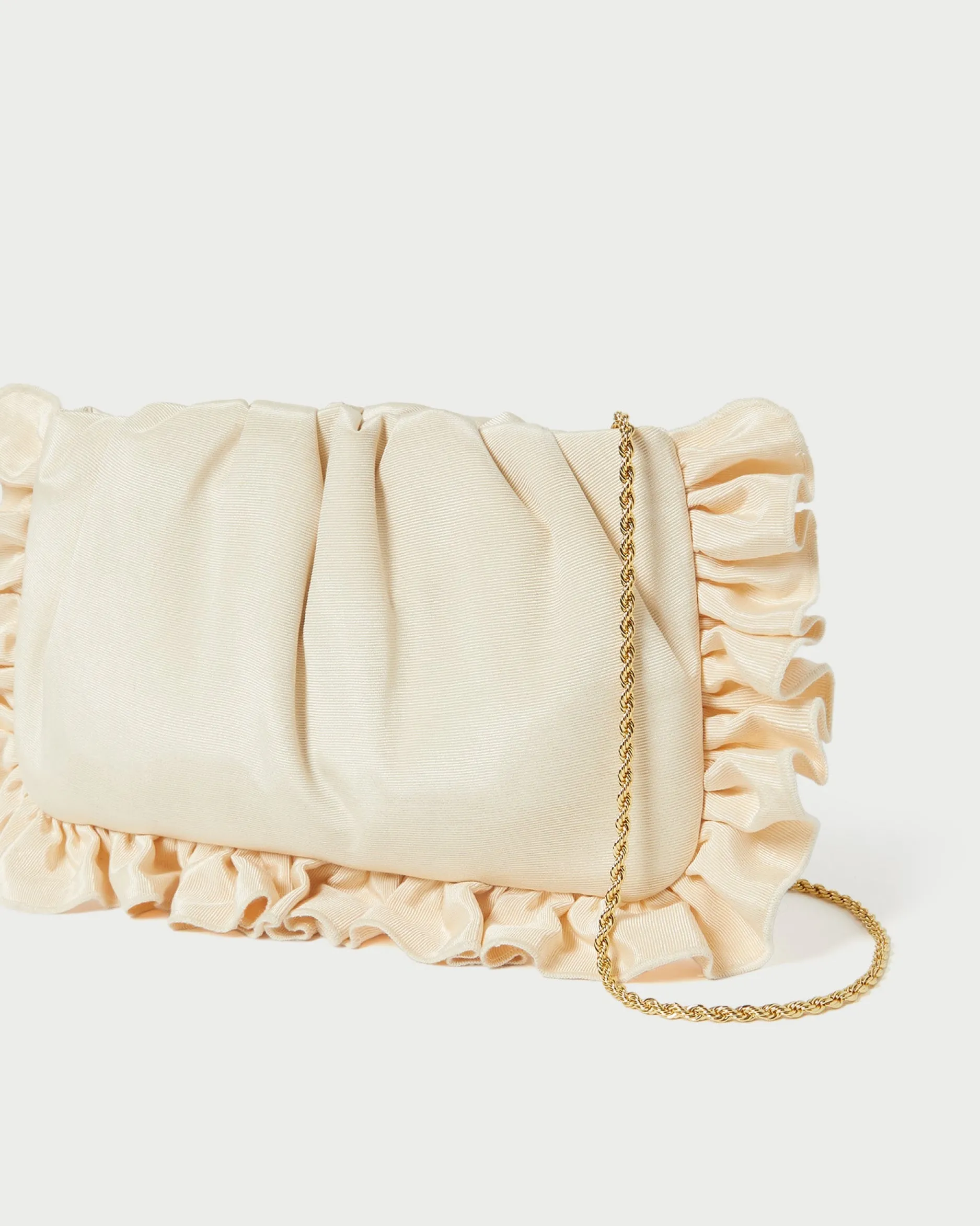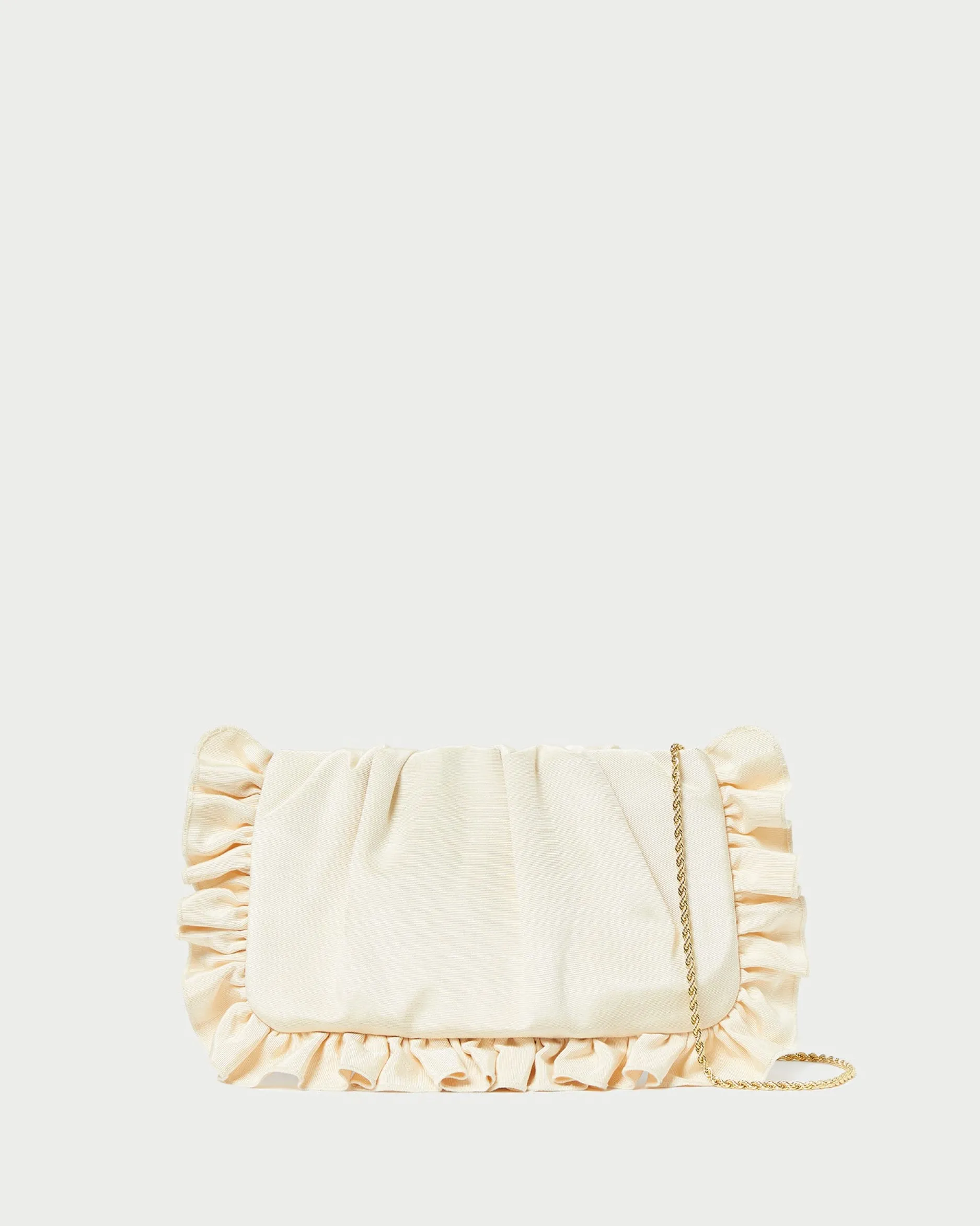 Welcome to Loeffler Randall. Discover our collection of beautiful, handcrafted styles from shoes to RTW to accessories. |Clutch in natural crocheted raffia with ruffle detailing. Features a removable twisted gold chain strap, frame closure, and interior card slot.|We selected this material for its exceptional quality and appearance. As with most natural materials, variations in thickness and color are to be expected. Due to the delicate nature of the fiber, normal wear may occur over time. It is recommended that raffia not be exposed to water in order to maintain its appearance.|Clutch in black and brown checked taffeta with ruffle detailing. Features a removable twisted gold chain strap, frame closure, and interior card slot.||Clutch in vanilla moiré with ruffle detailing. Features a removable twisted gold chain strap, frame closure, and interior card slot.|Italian moiré fabric is delicate and subject to pulls in thread with contact to abrasive materials. Wear with care.|Clutch in black moiré with ruffle detailing. Features a removable twisted gold chain strap, frame closure, and interior card slot.|Italian moiré fabric is delicate and subject to pulls in thread with contact to abrasive materials. Wear with care.|Clutch in natural crocheted raffia with ruffle detailing. Features a removable twisted gold chain strap, frame closure, and interior card slot.